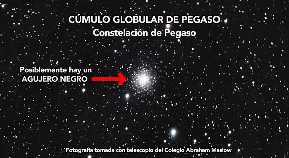 Increíble foto tomada por telescopio del Colegio Abraham Maslow. El Cúmulo de Pegaso, también conocido como Messier 15 (M15), es una de las joyas más antiguas y densas de nuestra galaxia. Se encuentra a unos 33.000 años luz de la Tierra, en la constelación de Pegaso, el mítico caballo alado. Este cúmulo globular contiene más de 100.000 estrellas apiñadas en una esfera de unos 175 años luz de diámetro, pero tan compacta que su núcleo brilla con una intensidad deslumbrante. De hecho, los astrónomos creen que en su centro podría esconderse un AGUJERO NEGRO de masa intermedia o una concentración extrema de estrellas de neutrones. FUERON NECESARIAS 320 fotografías para lograr esta vista magnífica del Cúmulo de Pegaso. Nos pareció fantástico fotografiar posiblemente un agujero negro.