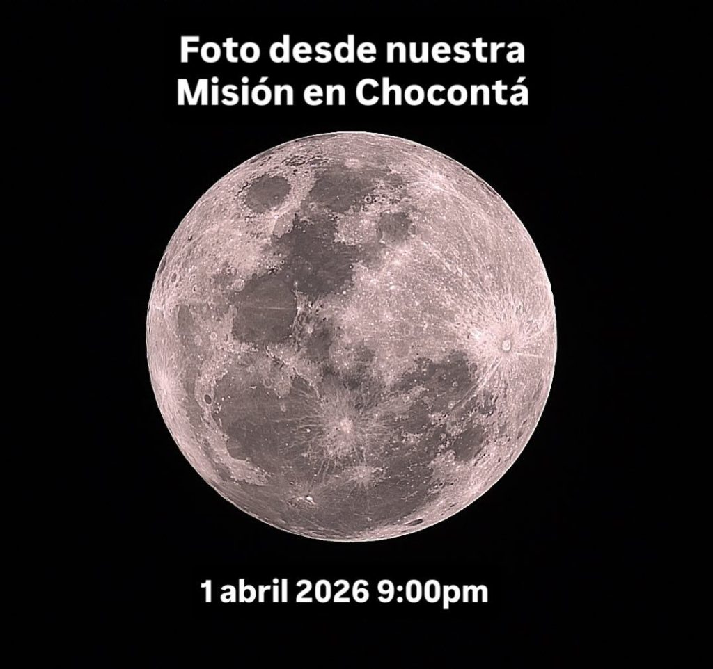 Tomamos esta hermosa fotografía de la Luna llena hoy 1 de abril 2026 a las 9pm. Estamos en nuestra Misión Chocontá. En este momento se dirige a la Luna la Misión Artemis 2. Por esto nos pareció interesante compartirla. En total tomamos 150 fotos que apilamos en una de alta calidad. Un abrazo astronómico.